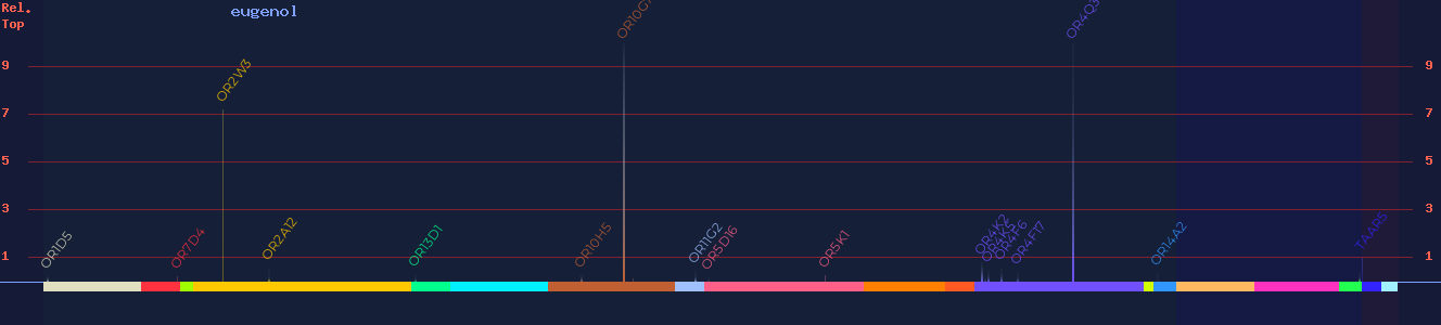 | OR10G7 | 80 | -8 2, -3.83 3, -9 7, -6.29 10 | 5.654 2, 3.8333 3, (agonist) 7 | vanilla, clove, carnation, smoky, spicy | |