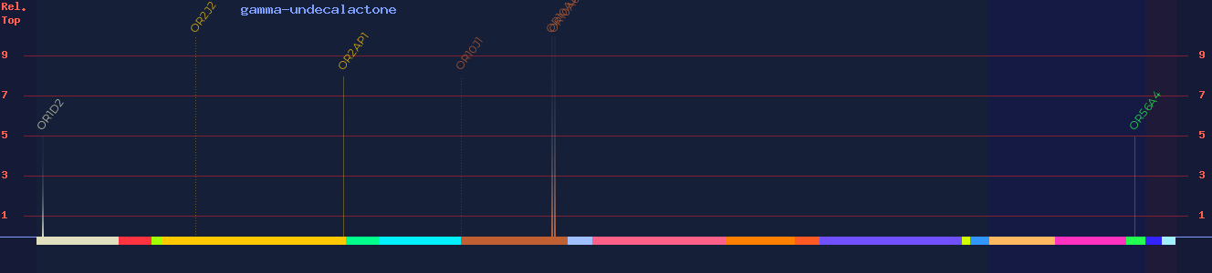 | OR10J1 | 80 | - | (probable agonist) 7, (agonist) 8 | peach, coconut, lactonic, creamy, buttery | |